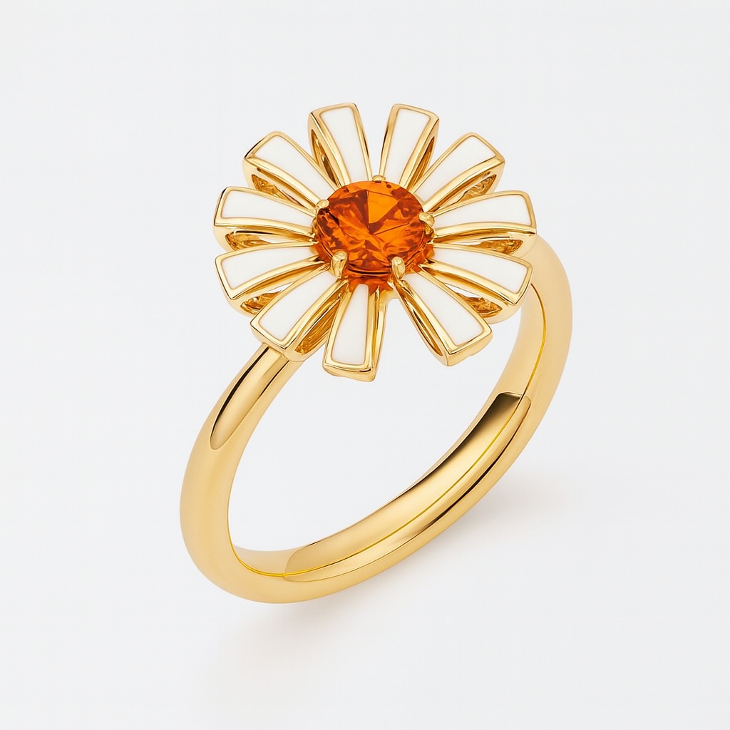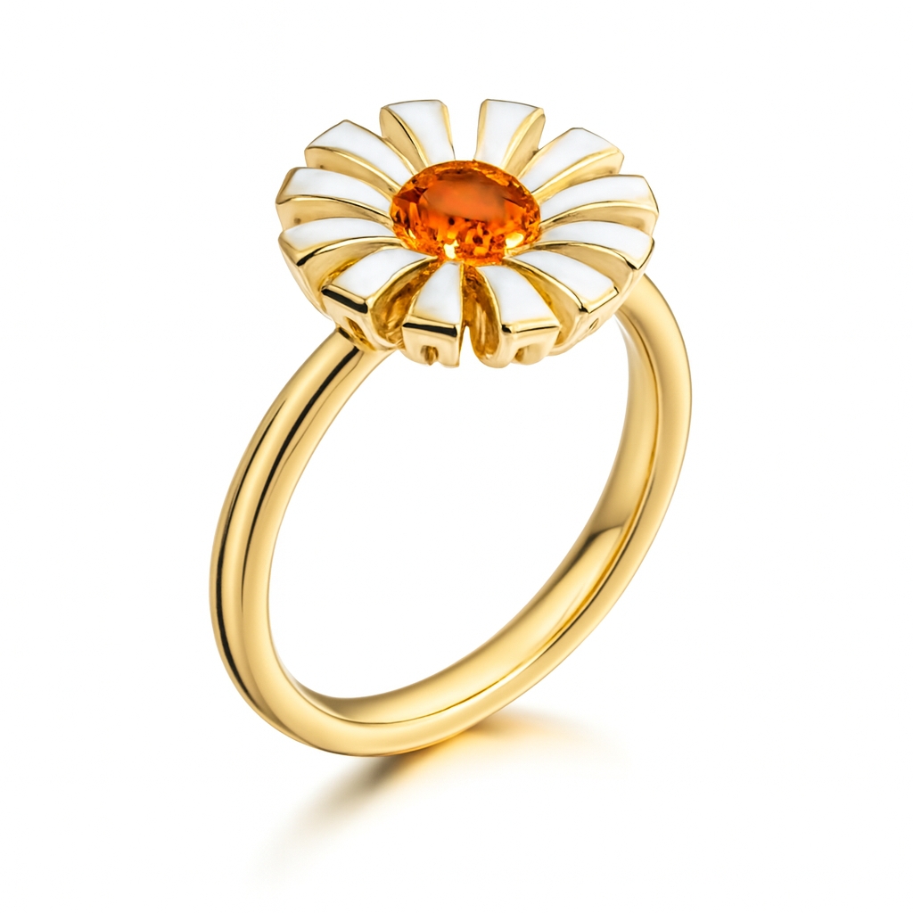 太陽のように輝くオレンジシトリンを中央にあしらった、フラワーモチーフのゴールドリング。エナメルで縁取られた花びらが、上品でモダンな印象を与えます。