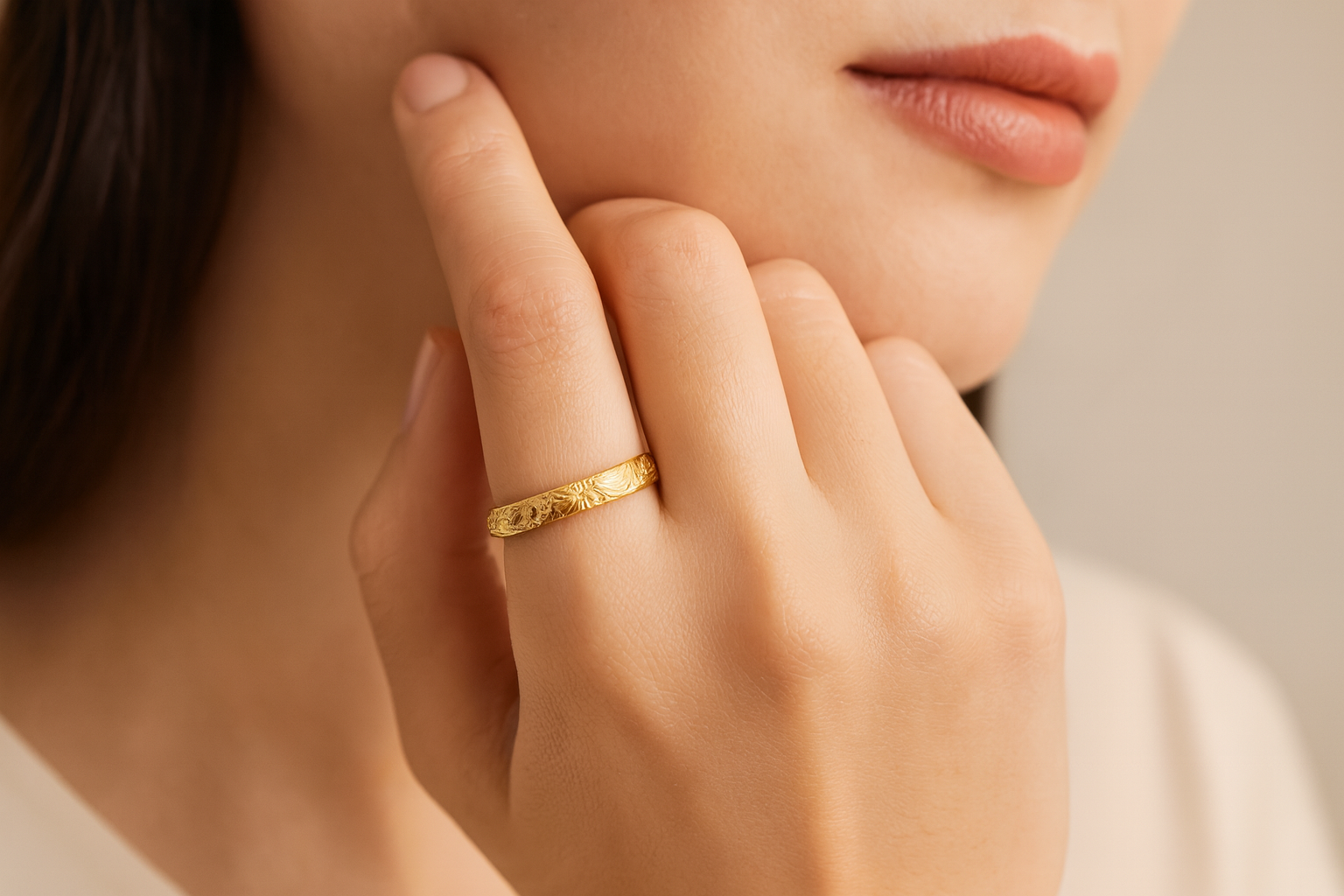繊細なフローラル模様を立体的に彫り込んだ、気品あふれるゴールドリング。