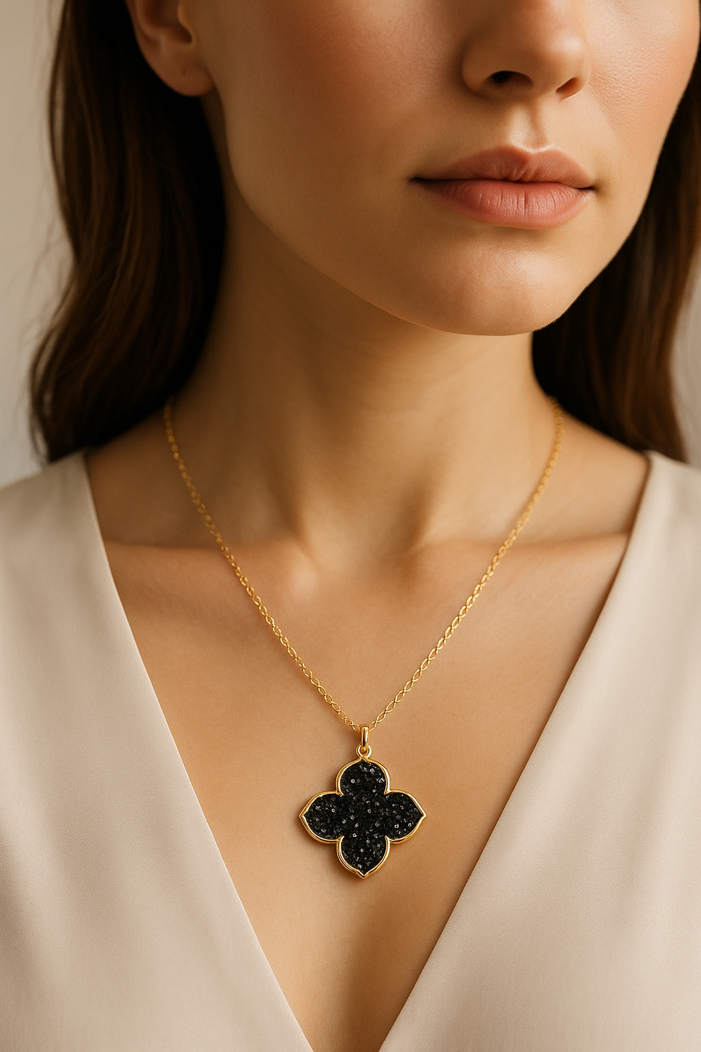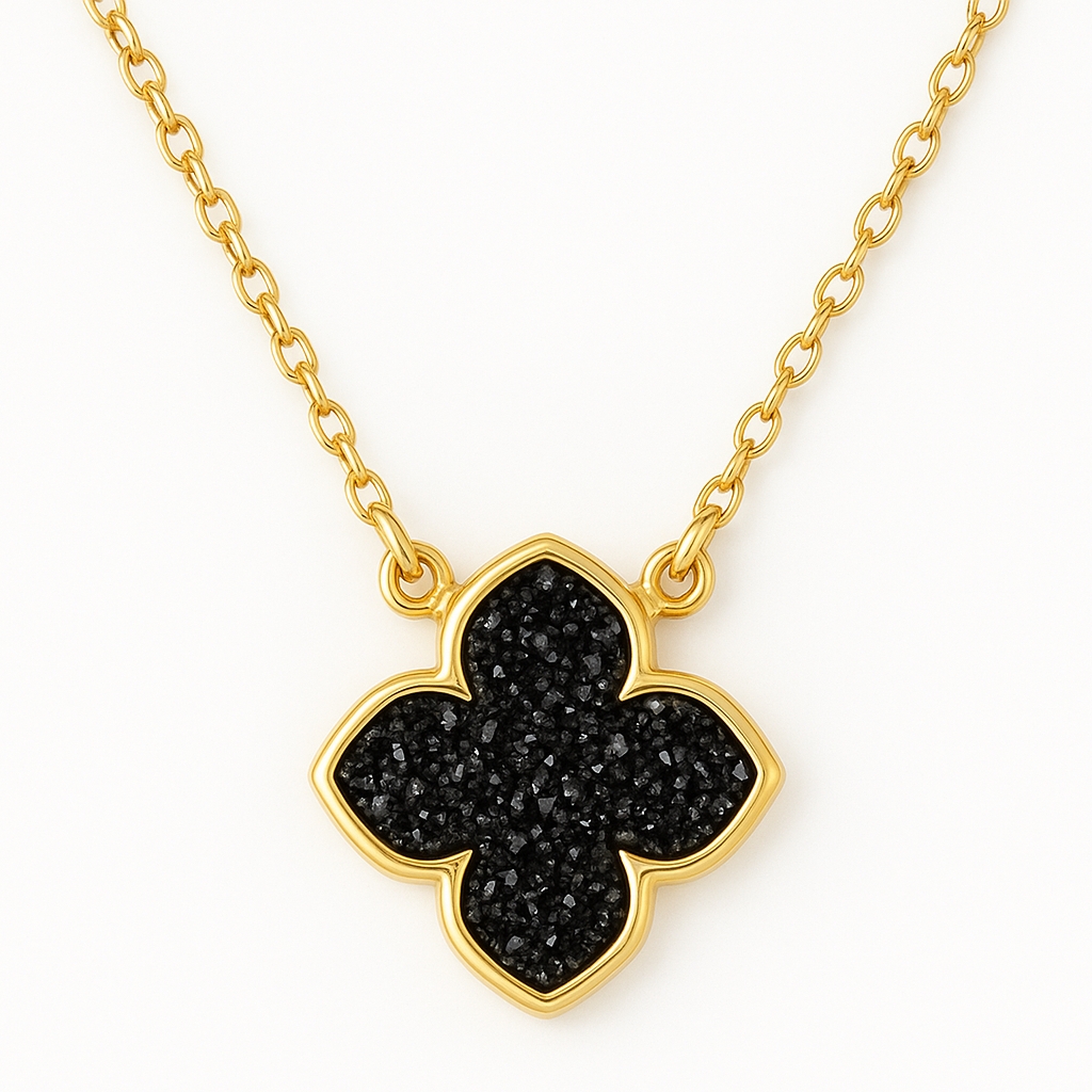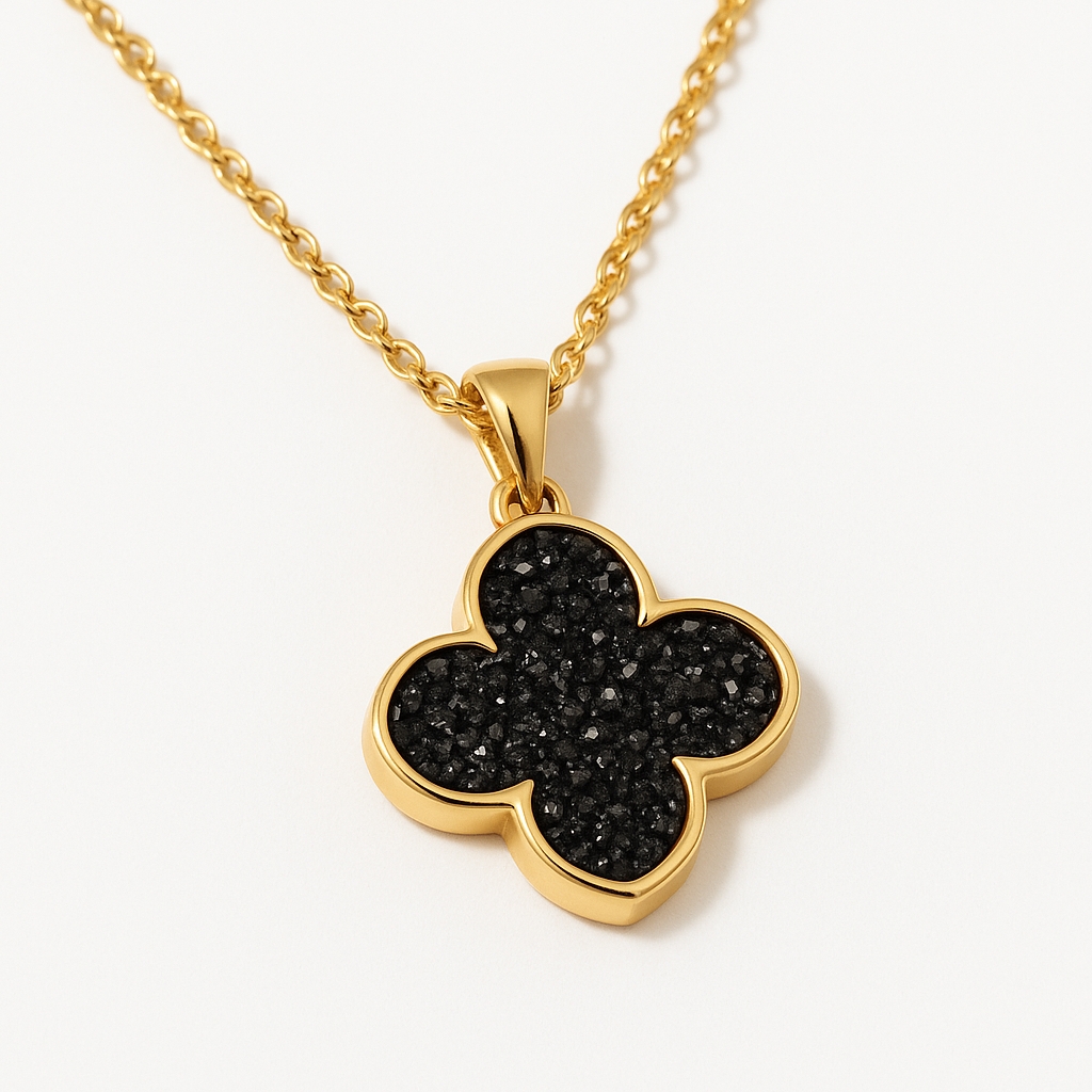 漆黒の輝きを放つドゥルージーストーンを、四つ葉のクローバーモチーフにあしらったラグジュアリーなネックレス。