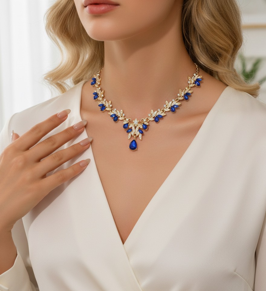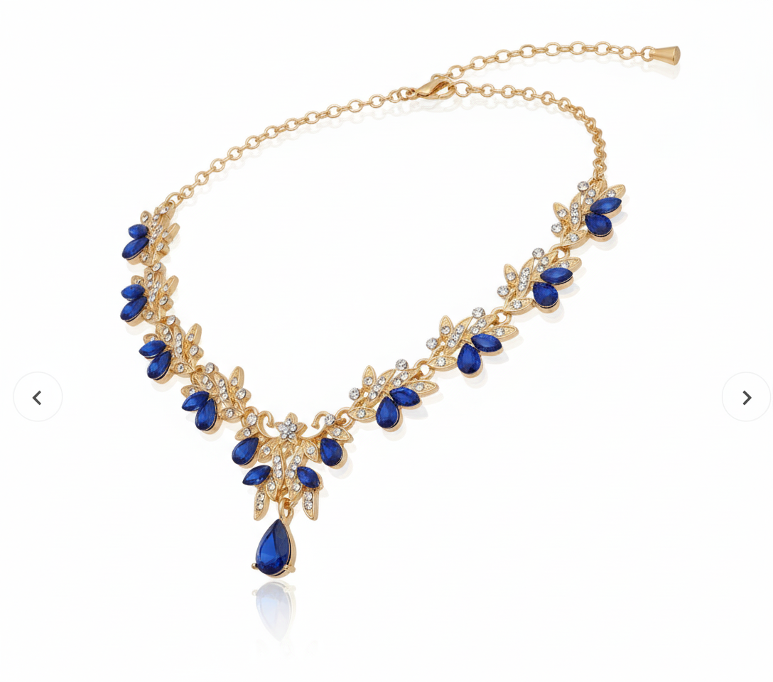 王侯貴族の装飾品を思わせるような荘厳なデザインが魅力の「ロイヤルブルー・エレガンスネックレス」。深みのあるサファイアブルーのティアドロップカットストーンを中心に、繊細なリーフモチーフを配したゴールドベースが、首元を華やかに彩ります。